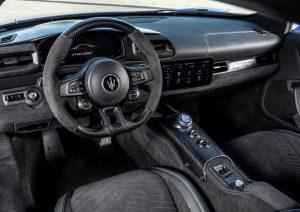 Meteen vind ik een ideale rijpositie. Alles ligt binnen handbereik en ook hier is de elegantie aanwezig, zelfs voor het grote centrale scherm. De ergonomie is “normaal”: geen bediening voor de richtingaanwijzers op het stuur zoals bij Ferrari of ingewikkelde toestanden zoals bij McLaren. Dat is heel positief, want waarom het wiel opnieuw willen uitvinden nu we allemaal gewend zijn aan een zekere ergonomische standaardisatie? Daar tegen ingaan zou contraproductief, zelfs gevaarlijk zijn.